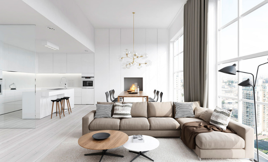 Не стоит увлекаться белым цветом при обустройстве просторных помещений, чтобы не создать прохладную, неуютную обстановку. Рекомендуется разбавлять интерьер деревянными поверхностями для поднятия цветовой температуры помещения.