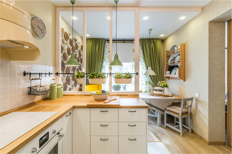 Дизайн светлой кухни в скандинавском стиле ― минимализм, много света, натуральные текстуры (хлопок, дерево, цветы). Это почти всегда бежевые, серые, белые цвета, растения в горшках, кадках.