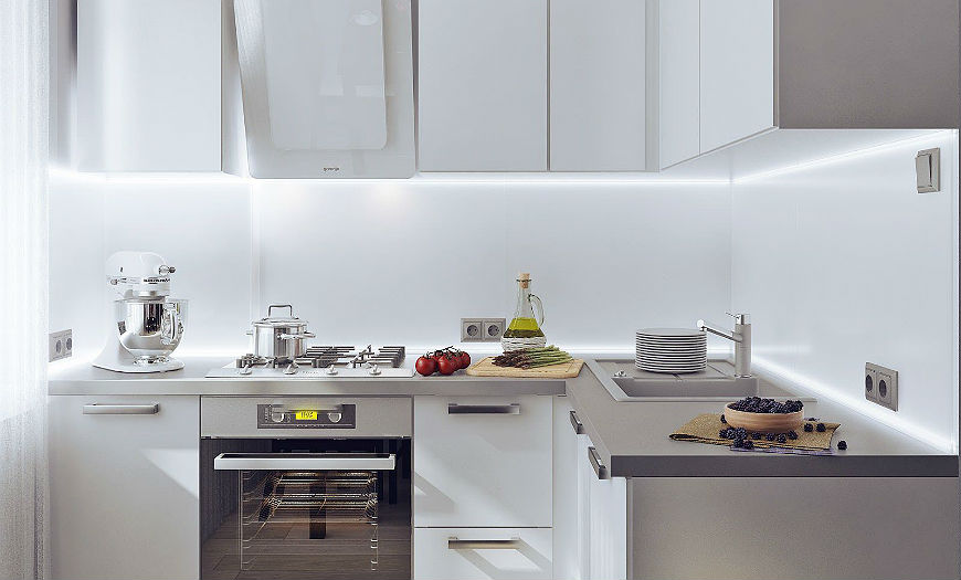 Для маленькой кухни белый цвет – одно из лучших решений. Он визуально расширяет пространство, прекрасно отражает свет, никогда не надоедает и не утомляет.