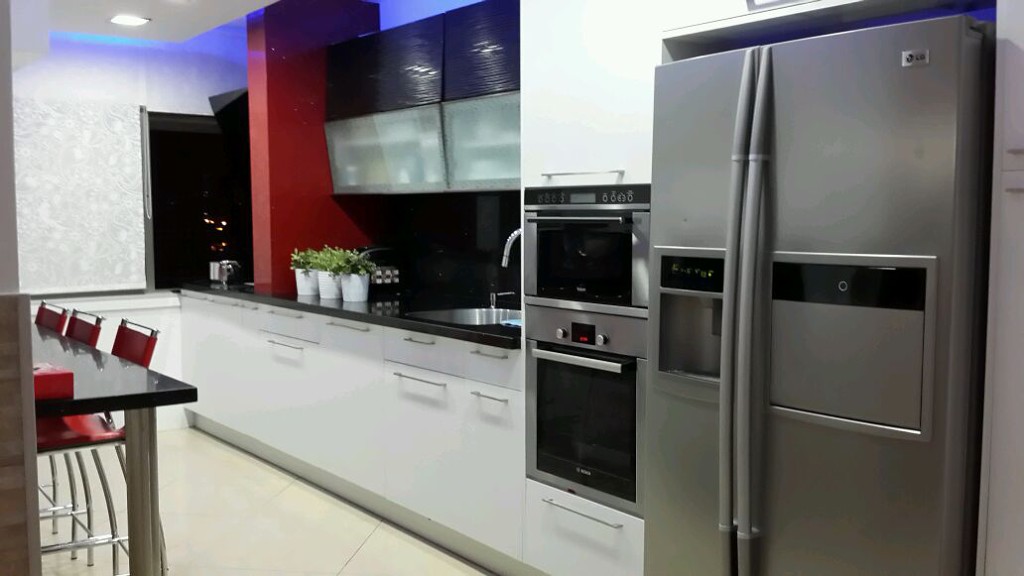 Наиболее интересное оформление получается, если использовать третий колер, в качестве яркого контраста. На белой кухне с практически полностью черной техникой, дополнительным колером станет красный – это отдельные линии на фасадах, посуда, текстиль.