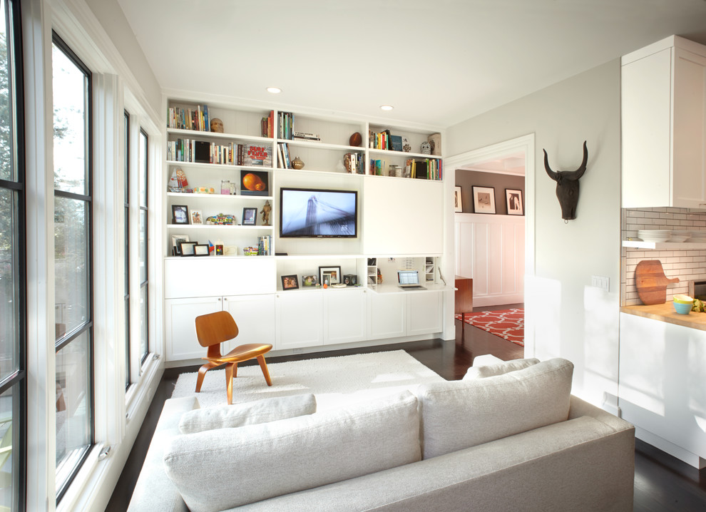 Вместо нескольких предметов мебели для хранения (комод, стеллаж, шкаф), расставленных по углам, используйте одну конструкцию с открытыми и закрытыми полками вдоль одной из стен.