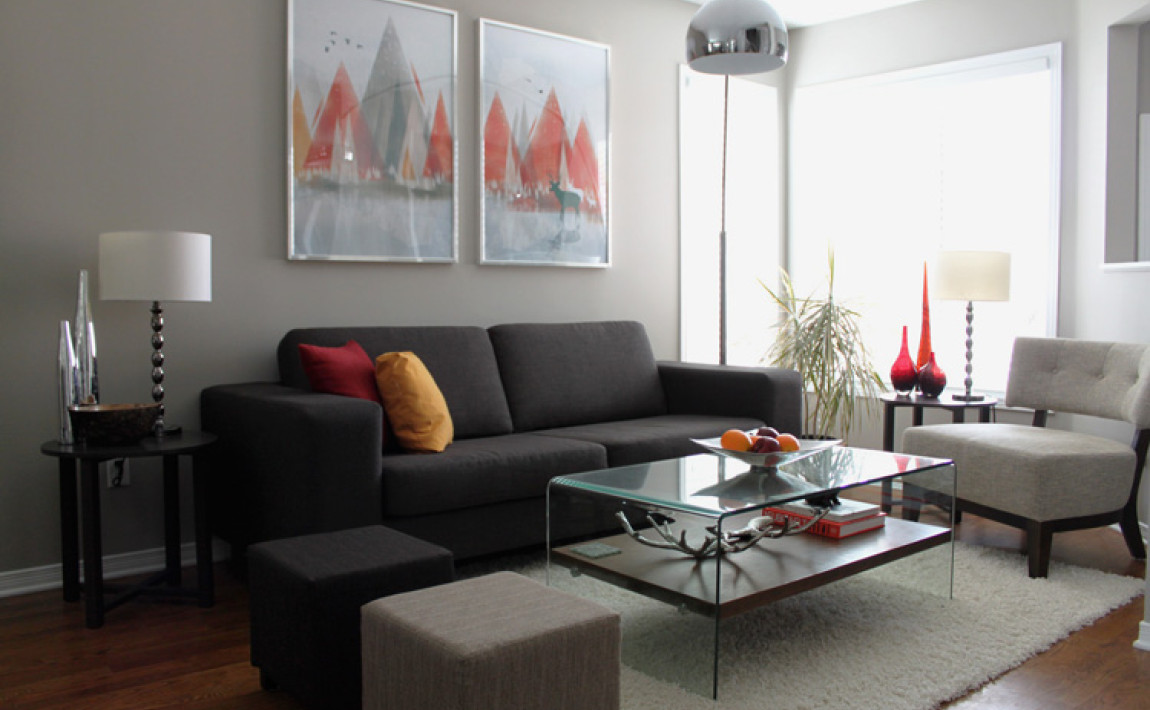 Журнальный столик и аксессуары должны быть темнее основного гарнитура на один тон.