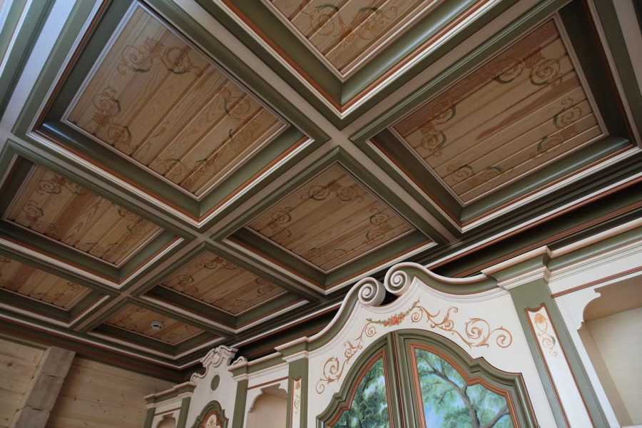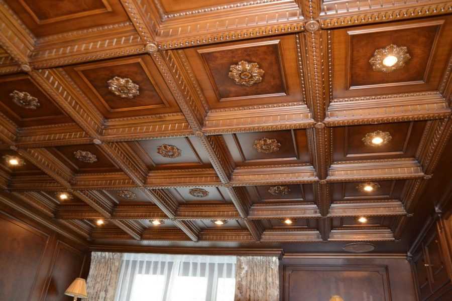 Роскошное оформление смотрится аристократически. Эта балочная конструкция, в которую вкраплены определённые углубления, изготовлена из натуральной древесины. Трудоёмкость и солидная стоимость заставляют прибегнуть к альтернативам из гипсокартона, МДФ, полиуретана. Устройства характеризуются долговечностью, хорошими акустическими свойствами и премиальной внешностью.