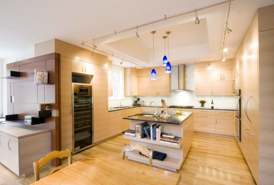 Людям, в чьих домах такая просторная кухня, повезло намного больше. Они могут оформить одно помещение в нескольких стилях. К примеру, пол в проходе на кухню можно выложить ламинатом, а участок за барной стойкой – разноцветными плитками.