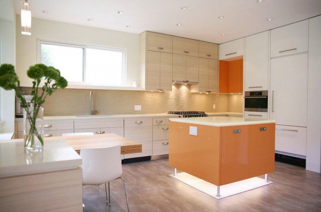 Оживить интерьер кухни помогут яркие контрасты Интересно смотрится сочетание серо-бежевого, белого и ярко-оранжевым цветов. Не обязательно использовать мебель одного оттенка. В большом помещении можно зонировать рабочую зону бежевой или серо-белой столешницей, а на противоположной стороне установить глянцевую мебель.