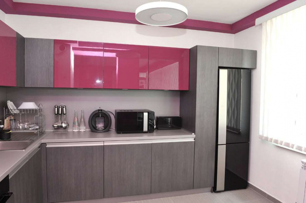 Фартук для такой кухни так же можно выбрать в соответствующих оттенках или сыграть на контрасте и сделать кухню яркой и надолго врезающейся в память.