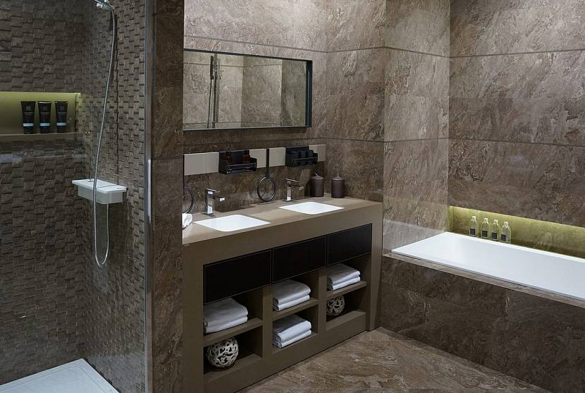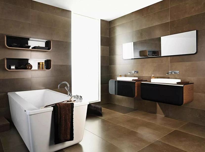 Стильный дизайн коричнево-бежевой плиткой в ванной