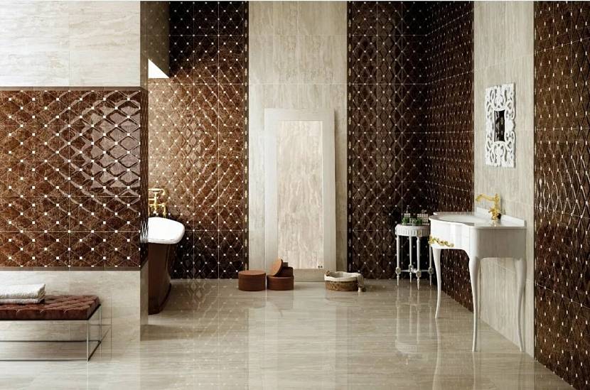 Коричневый кафель из керамики – более дешёвый облицовочный материал. Его основа – глина. После её формовки и обжига, получаются модули, которые имеют подходящие для эксплуатации ванной технические характеристики. Поверхность кафеля можно раскрашивать, создавать разные рисунки, наносить разные расцветки. Разнообразие существующих вариантов настолько велико, что можно без труда реализовывать любой, даже самый смелый дизайн.