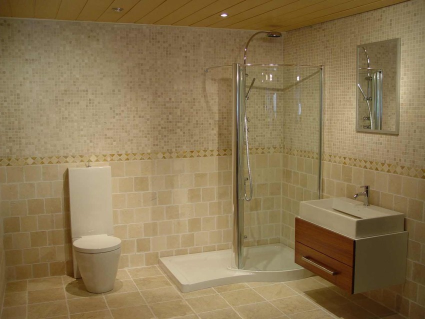 Дизайн ванной комнаты в бежевом цвете с отделкой стен керамогранитной плиткой