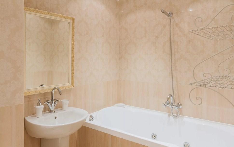 Навесные пластиковые панели тоже отлично подойдут для любой бежевой ванной комнаты. К тому же они влагостойкие и прослужат достаточно долго. Цвет стоит подбирать из бежевой палитры.