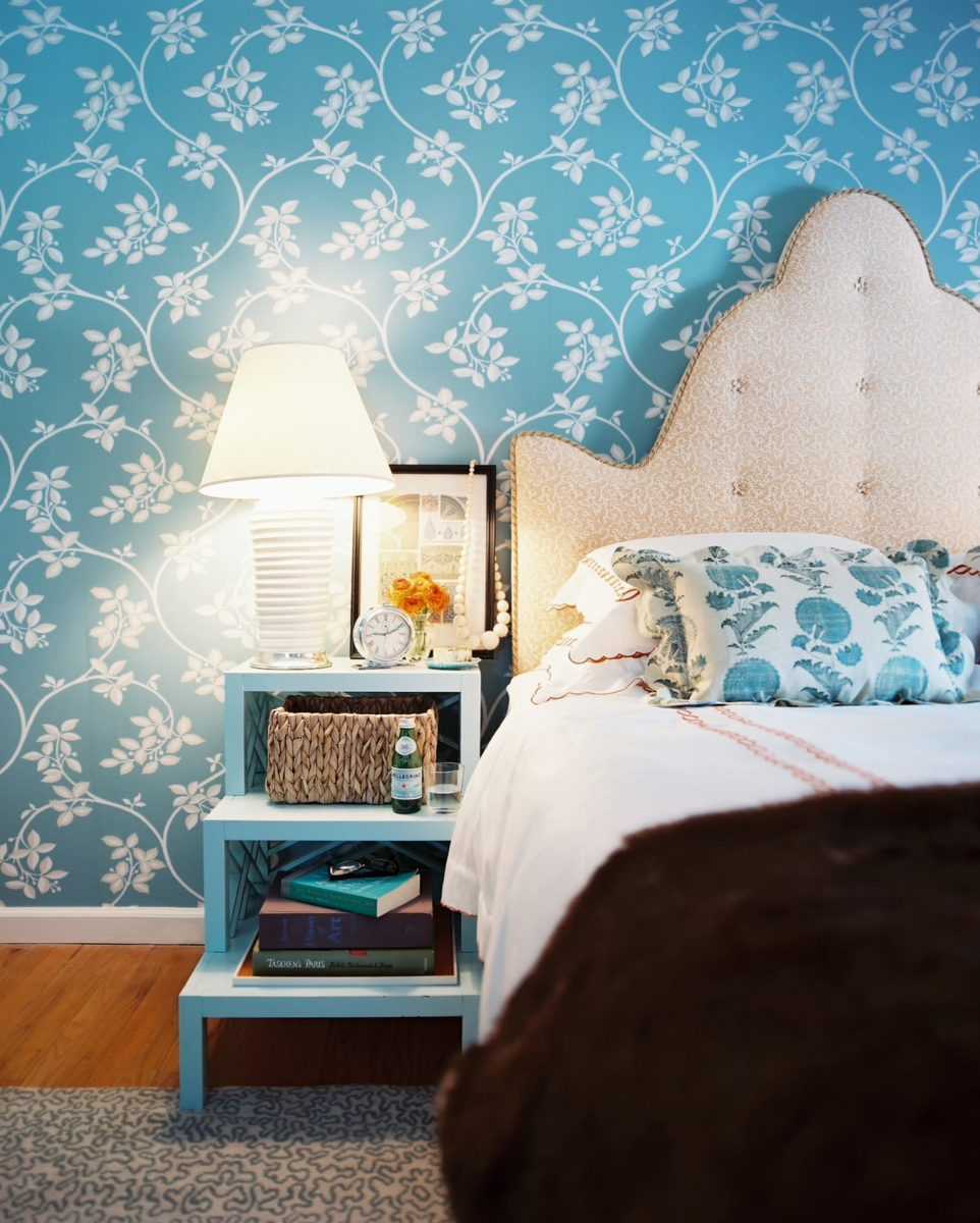 А вот если покрыть стены бирюзовыми обоями, а поверх них нанести серебристый орнамент, придаст комнате уникальности и необычности.