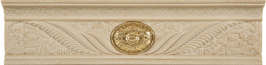 С напылением золотистого или серебристого оттенка. Этот фриз еще сложнее вписать в дизайн. Если в остальном оформлении нет элементов такого цвета, то одинокие вкрапления золота и серебра смотрятся неуместно.