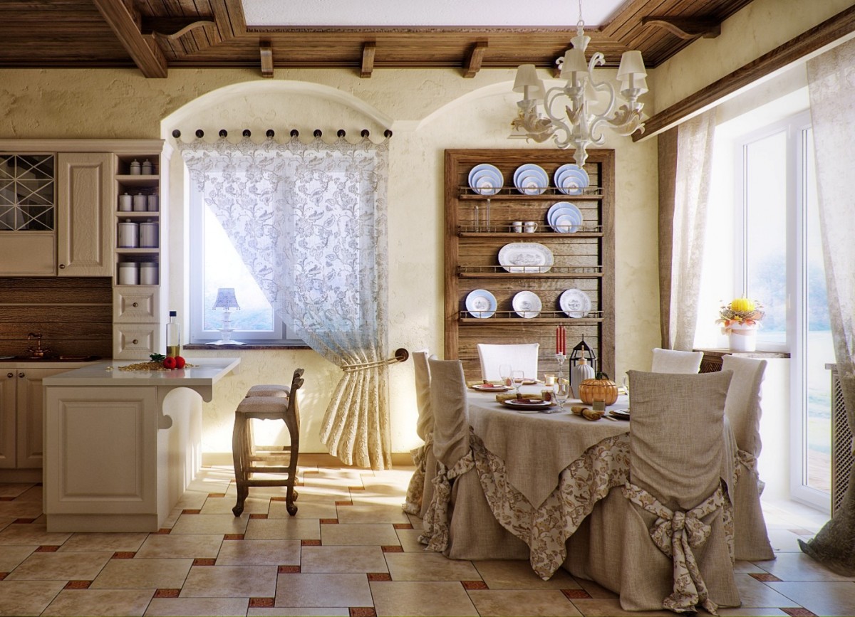 Для создания гармоничного интерьера на кухне необходимо сшить чехлы на стулья из ткани, которая по цвету перекликается с оттенками штор или скатерти. Предпочтительней всего выбирать нежные кремовые оттенки, которые являются универсальными и хорошо выглядят в любом дизайне. Но в условиях кухни светлые цвета являются наиболее подвержены загрязнениям, поэтому чехлы придется слишком часто стирать.