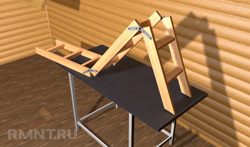 Строительство откидных лестниц имеет схожую технологию со складными. На первом этапе изготавливают приставную лестницу по описанной выше технологии. После чего выберите для себя более подходящий из двух вариант: