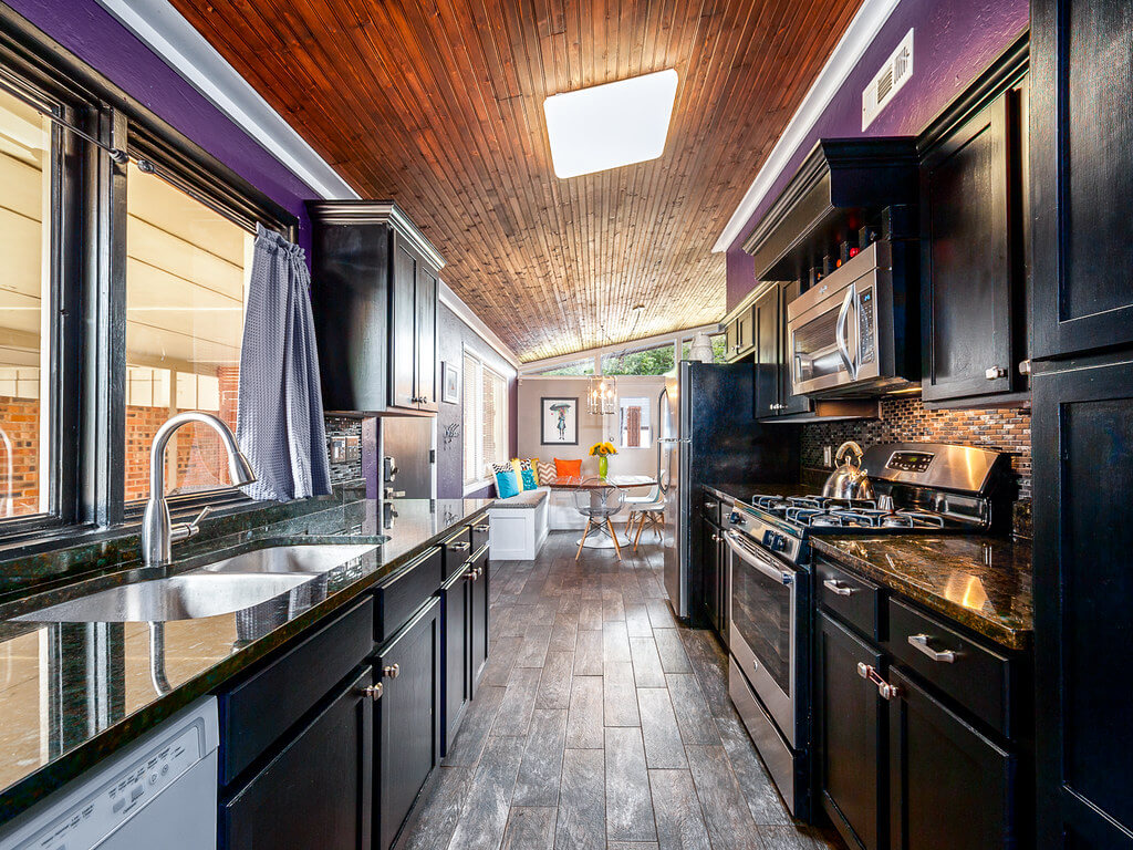 - Темные тона помогают сгладить визуальный дисбаланс помещения. Если комната нестандартная, слишком высокая или широкая, темная кухня — достойное решение, чтобы сделать ее более сбалансированной.