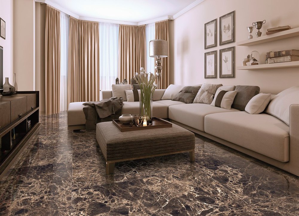 Бронза в современной гостиной — минималистичный стиль гламура. Такой декор позволит обставить элегантную гостиную. Доминирующие цвета — черный, белый и коричневый. Со светлым полом и темным диваном коричневый коврик и другие аксессуары идеально сочетаются. Зона гостиной с темно-коричневым диваном вписывается в светлый ковер.