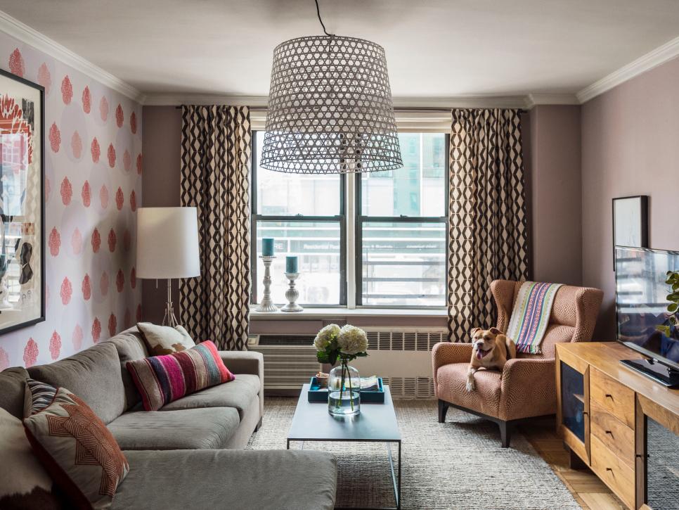 Розовая гостиная с белой отделкой для веселой, эклектичной атмосферы