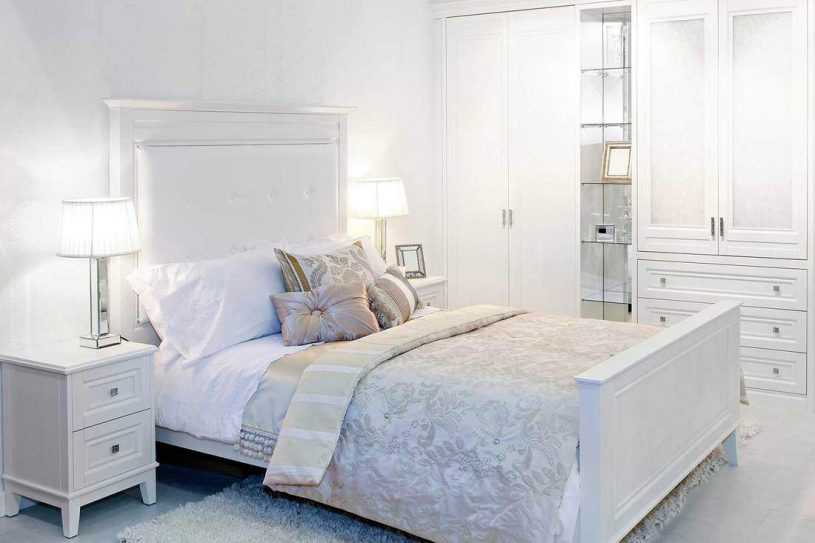Если в дизайне спальни преобладает белая цветовая гамма необходимо правильно совместить аксессуары с мебелью.