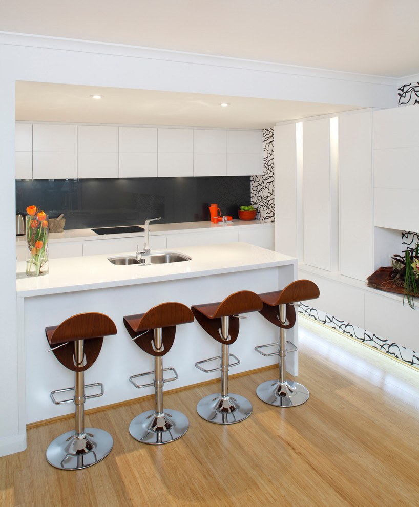 Черной может быть мебель, аксессуары, узоры. Необходимо выбирать элементы декора черного цвета одинаковой насыщенности — разнобой оттенков на белом фоне вызовет ощущение диссонанса. Не рекомендуется использовать черный цвет в местах попадания естественного освещения.