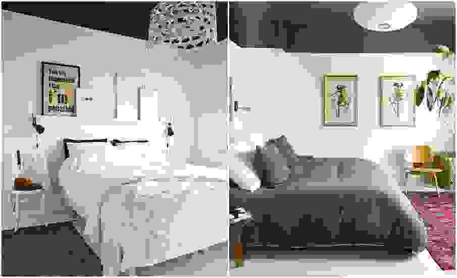 Светлая спальня с черным потолком