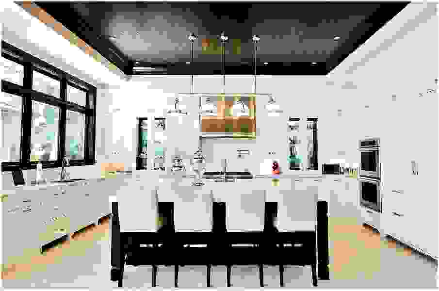 Просторная современная кухня с чёрным потолком