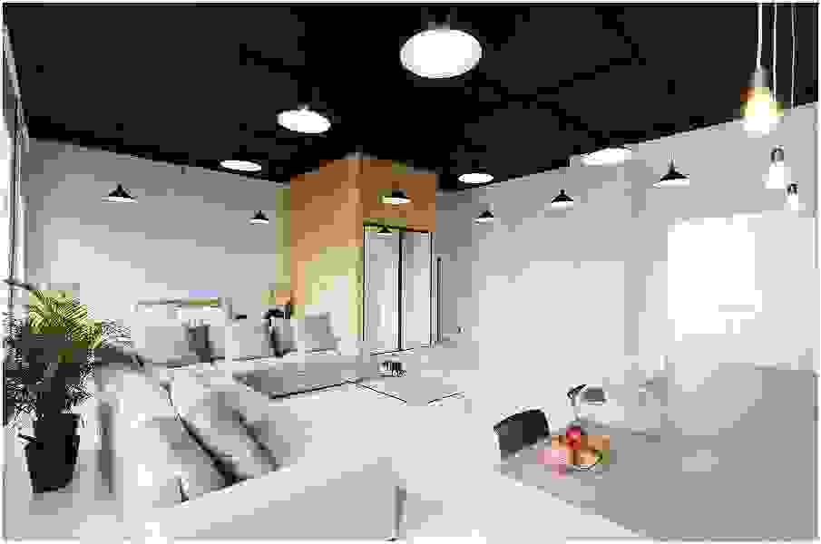 Минималистичная гостиная с контрастным чёрным потолком