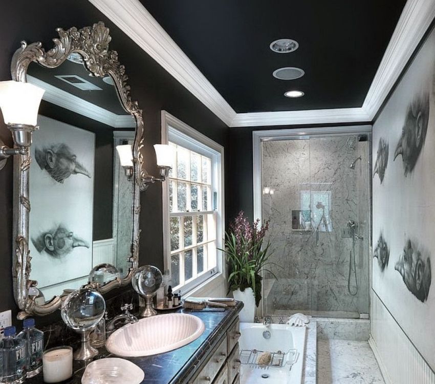В жилых помещениях черный потолок обычно встречается в санузлах, ванных комнатах и гостиных. Как правило, в спальнях такие потолки делают очень редко – для зоны сна больше всего подходят теплые оттенки, расслабляющие психику.