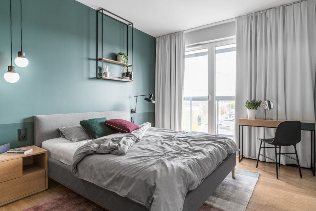 Зеленый и все его тона – позволяют расслабиться, снимают зрительное и эмоциональное напряжение, поэтому отлично подходят для спален. В случае скромного метража больше подойдут светлые оттенки, подбирать конкретный лучше всего под обстановку, освещенность и другие особенности помещения.