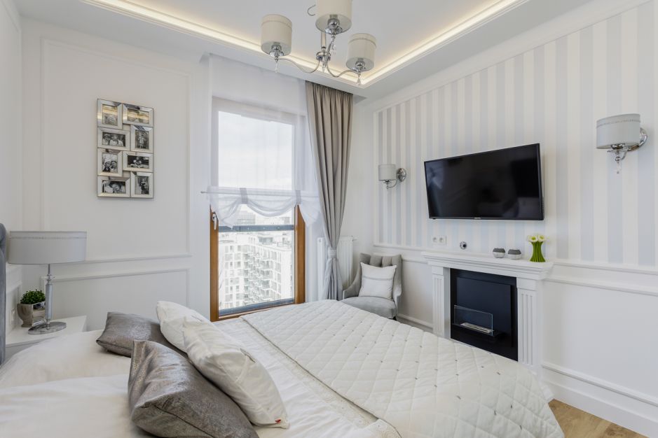 Для того, чтобы зрительно поднять высоту потолков существуют некоторые дизайнерские приемы. Обои с вертикальными полосками и темный широкий карниз между стеной и белым потолком помогут добиться желаемого эффекта