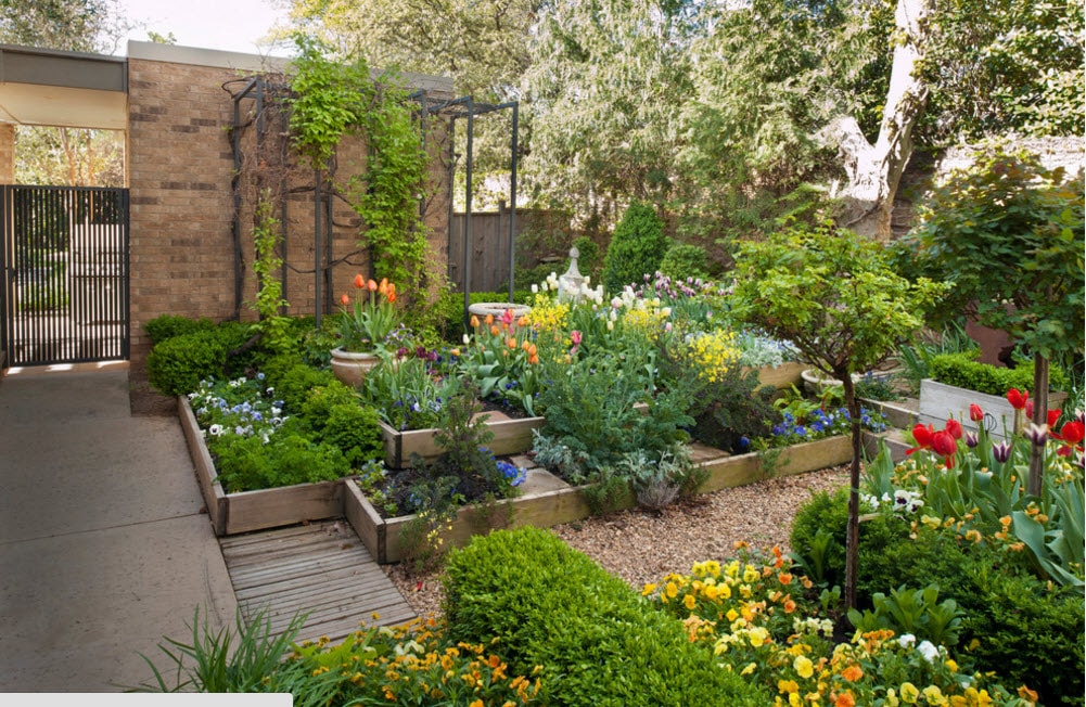 Простой и природный пейзажный стиль эффектно использует композиции из овощных и фруктовых растений. На даче нет бесформенных сплошных грядок и хаоса в пространстве. Ландшафтный дизайн объединенного сада с огородом напоминает классический парк. Алебастровые скульптуры сочетаются с мощеными дорожками и миниатюрными фонтанами.
