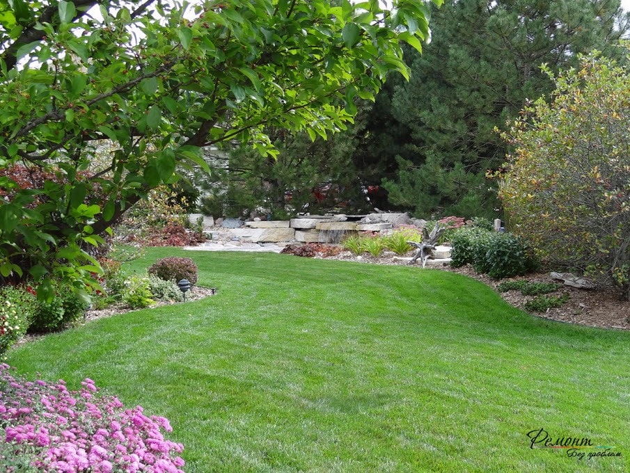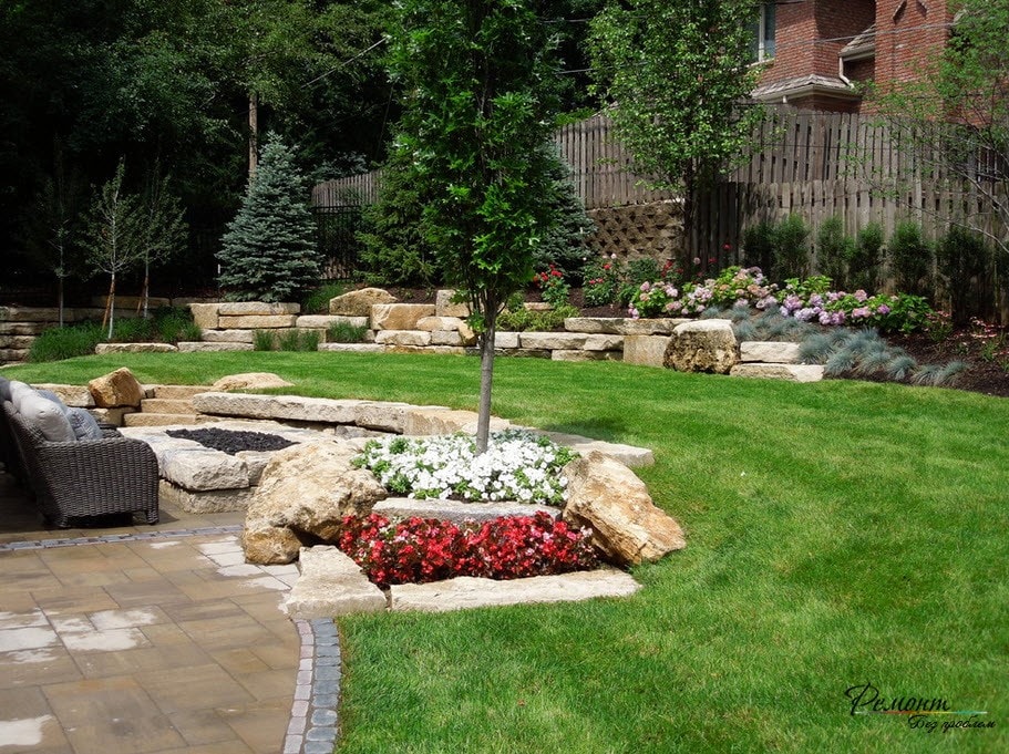 Такой вариант оформления ландшафта смотрится презентабельно и очень нарядно. Организуется несложно, имеет массу вариаций и форм. Главное в этом деле – правильное использование рельефа, чтобы он не оказался в диссонансе с общим стилем.