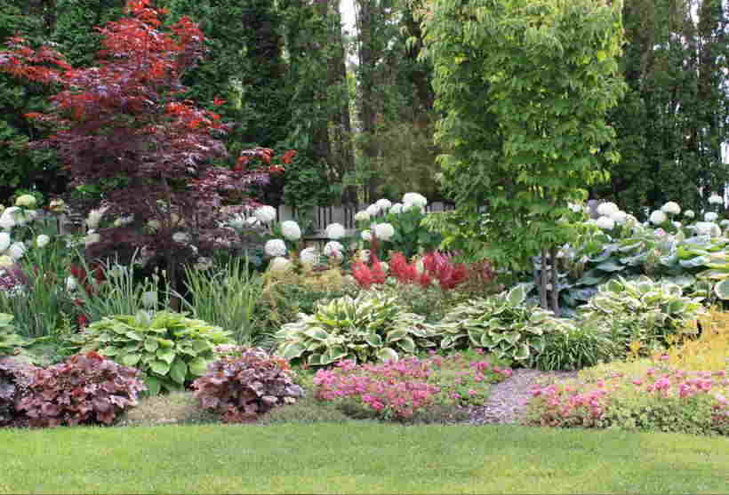 - групповые композиции, в них высаживаются несколько деревьев и кустарников в виде яруса.