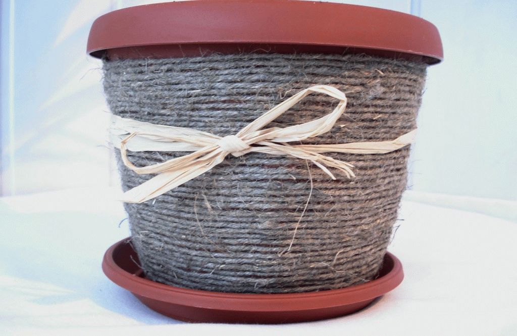 Чтобы полностью обвить горшок верёвкой и закрепить её, понадобится клей и умение вязать потайные узлы. Витки нужно начинать наматывать с натяжкой и вплотную друг к другу. Сажать верёвку можно на клей или жидкие гвозди, чтобы она не съехала и не уползла. Готовый горшок смотрится слишком просто. Можно прикрепить декоративные элементы к верёвке или использовать оригинальные плетения верёвок в виде косичек, связать из толстых ниток чехол.