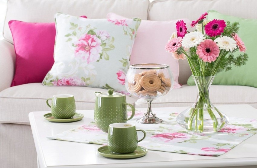 Для гостиной используют дорогие и необычные предметы, кухню украсит посуда и текстиль, в спальне основными предметами оформления станут шторы, пледы, занавески.