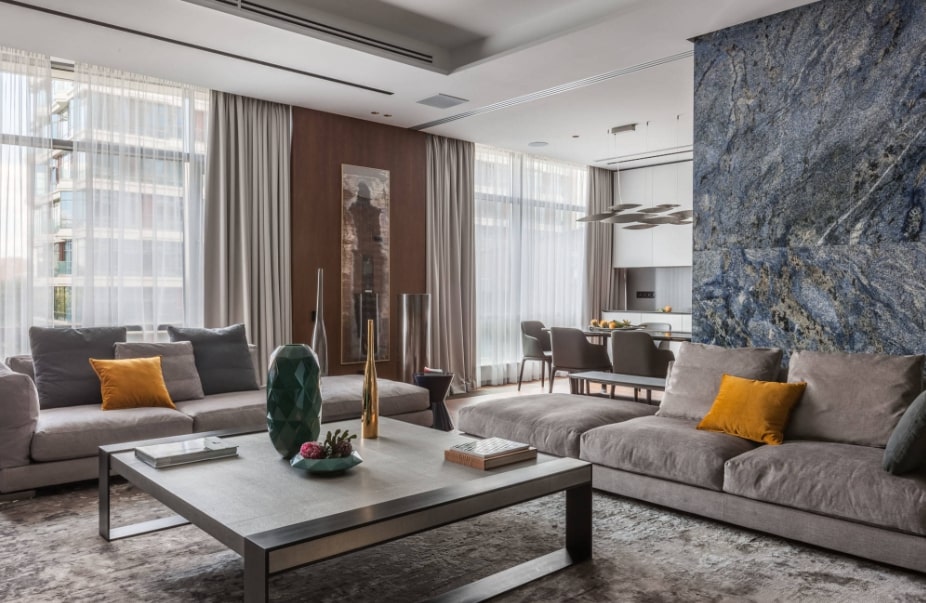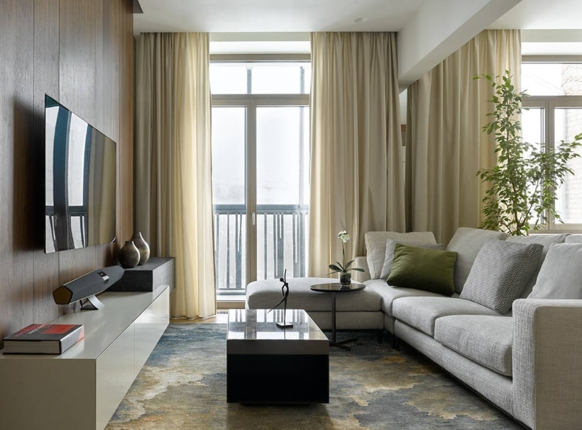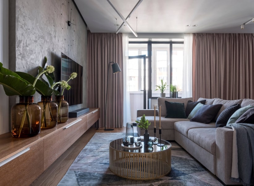 Гостиную с панорамными окнами чаще всего оформляют в минималистическом стиле