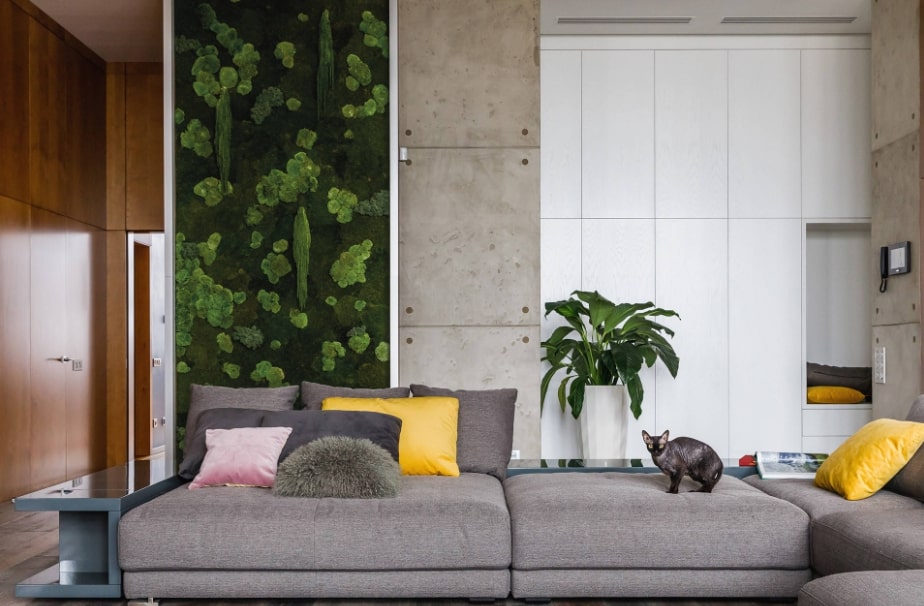 Отдельно стоит сказать о растениях. Например, высокое декоративное дерево может стать важным акцентом в комнате. Оно же визуально может сделать комнату выше, чем она есть. И этим приемом многие умело пользуются. Но растения, которые свисают с верхней части стены, делают обратное дело – уменьшают зрительно высоту потолков.