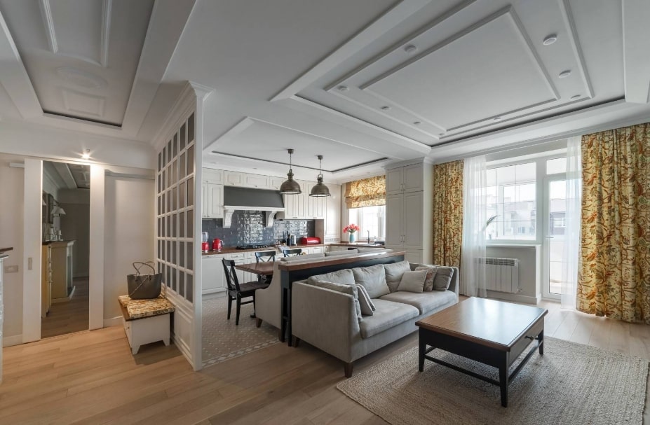 - Использование разных стилей мебели, цвета потолка и освещения одновременно. Для кабинета можно выбрать строгую, гладкую мебель, темный потолок и ламинат на полу, а остальную зону оформить мягкой мебелью, длинноворсовым ковром и