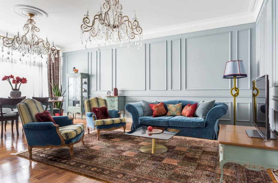 В классическом стиле уместными будут гобелены, выполненные своими руками, ковры небольших размеров и картины, написанные известными художниками. Большие зеркала в деревянных резных рамах привнесут определенную изысканность в помещение.