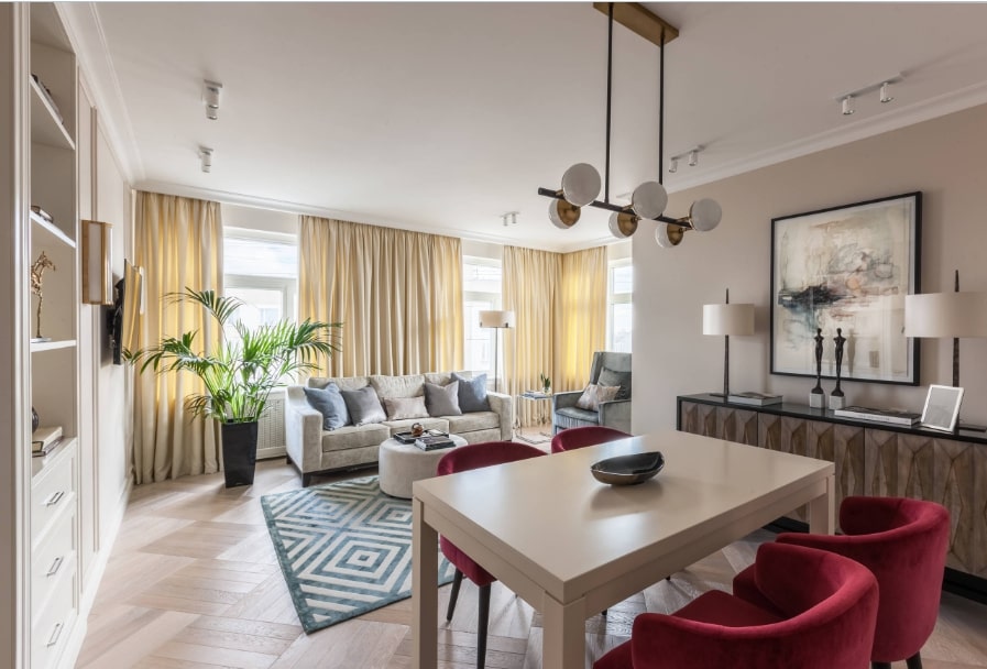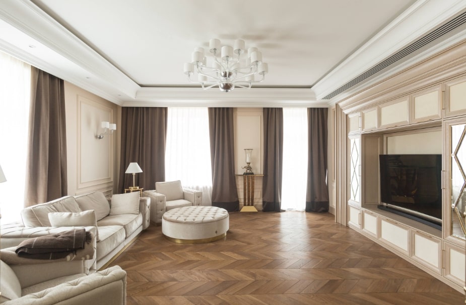 Пол создаёт основу для будущего интерьера. Он подчёркивает стиль гостиной или представляет собой нейтральный вариант, подходящий для любого дизайна. Самым распространённым материалом для зала выступает ламинат или паркетная доска.