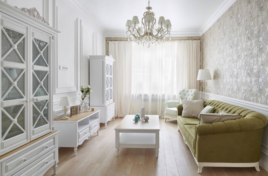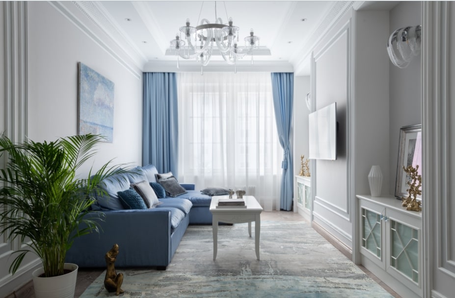 В данном случае применяют светлую палитру для стен, а в тон к основному цвету помещения подбирают легкие струящиеся шторы. Центральную люстру дополняют точечной подсветкой.
