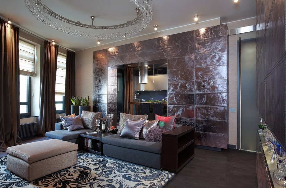 - Стилем мебели. Для зоны более расслабленного общения можно использовать мягкую мебель, меховые накидки или ковер с длинным ворсом. Для зоны славы и приветственной части гостиной можно использовать более гладкие поверхности и холодные тона.