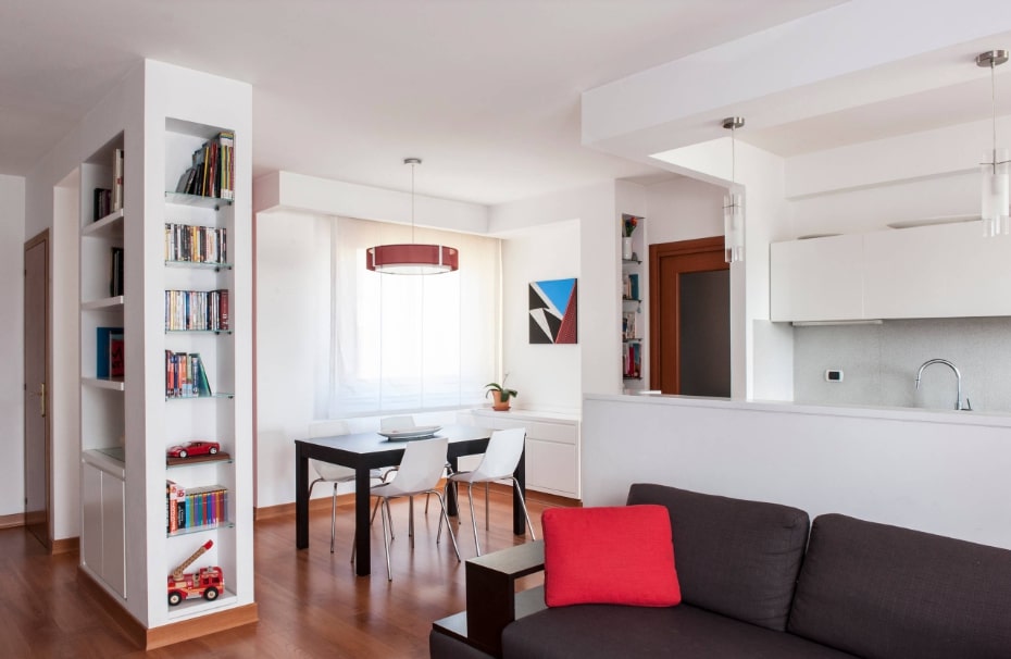 - Перегородки в виде сквозных стеллажей. Такой прием не уменьшает помещение зрительно, но позволяет отгородить отдельное, камерное пространство.