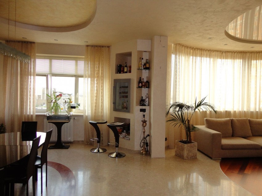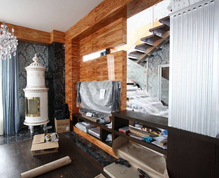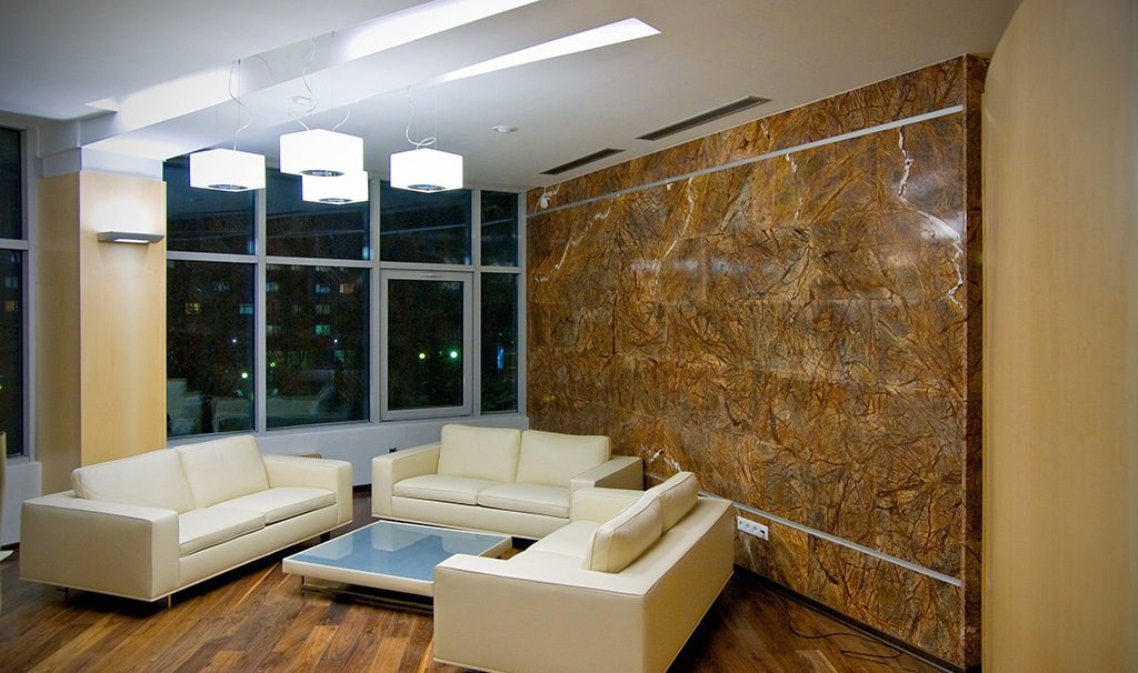 Отделать стены зала и гостевых комнат можно использованием керамогранита. Этот прочный материал имитирует большие поверхности из натуральных камней, что используются для отделочных работ. Относится к дорогостоящим декоративным материалам.