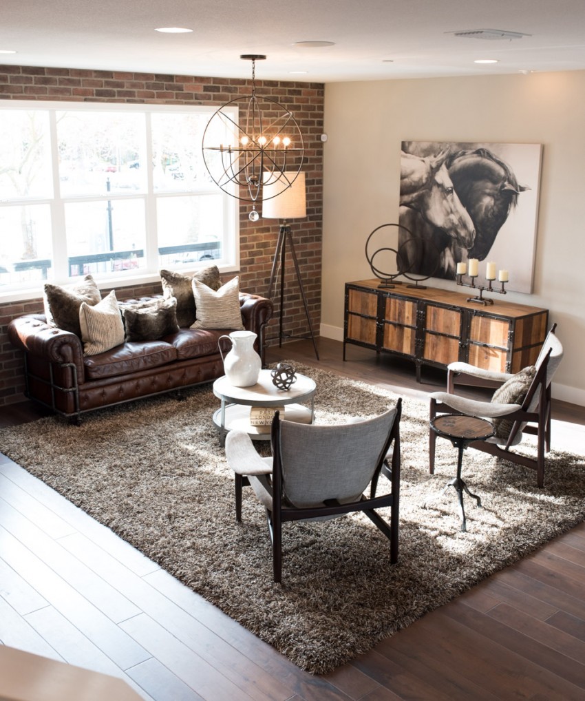 Гостиную-студию, оформленную в урбанистическом стиле лофт, уместно украсить постерами знаменитостей, афишами или раритетными плакатами в стиле арт-поп, помещенными в рамки, что бы не пустовало место.