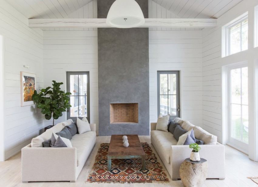 - Самый простой метод получить трендовую стеновую поверхность под бетон, использовать уже готовую бетонную поверхность. Белые бетонные стены – решение интересное, но далеко не у всех есть эта готовая стена под бетон. Аналогичный эффект можно сделать самому, если использовать специальную штукатурку. Она ничем не отличается от традиционного бетона со всеми характерными для него структурными эффектами. Такое покрытие может иметь любую фактуры, быть атласным, матовым, однородным или имитировать опалубку.