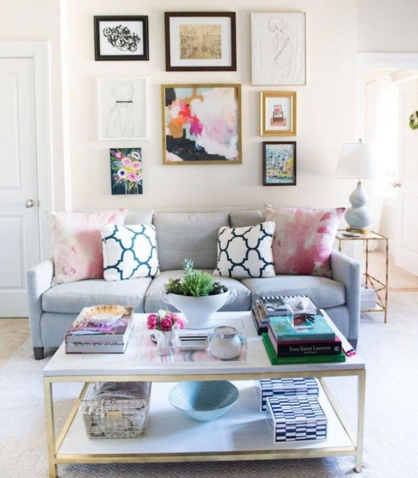 Когда в гостиной много мелких или однотипных предметов – это тоже быстро утомляет. На фото – пример с большим количеством снимков или картин в рамках.