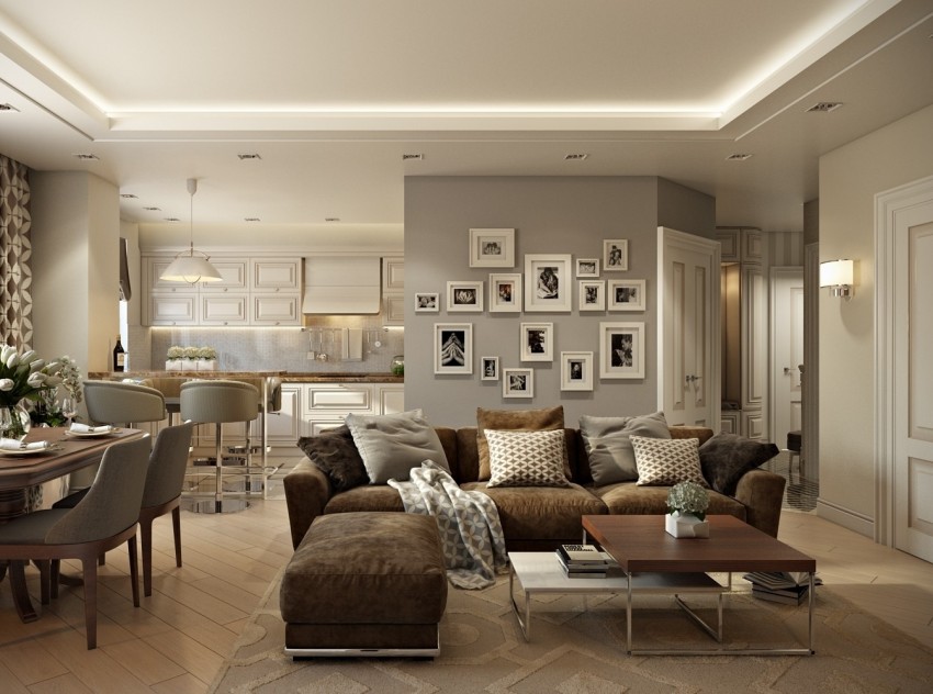 Если дизайн комнаты содержит пустую стену, то нужно обязательно разместить там украшение, так как именно это место будет привлекать на себя все внимание, а также сделать комнату безлюдной и холодной, что не приемлемо для гостиной. Дополнительно украсить одну из стен гостиной можно при помощи красивой картины или оригинальных часов
