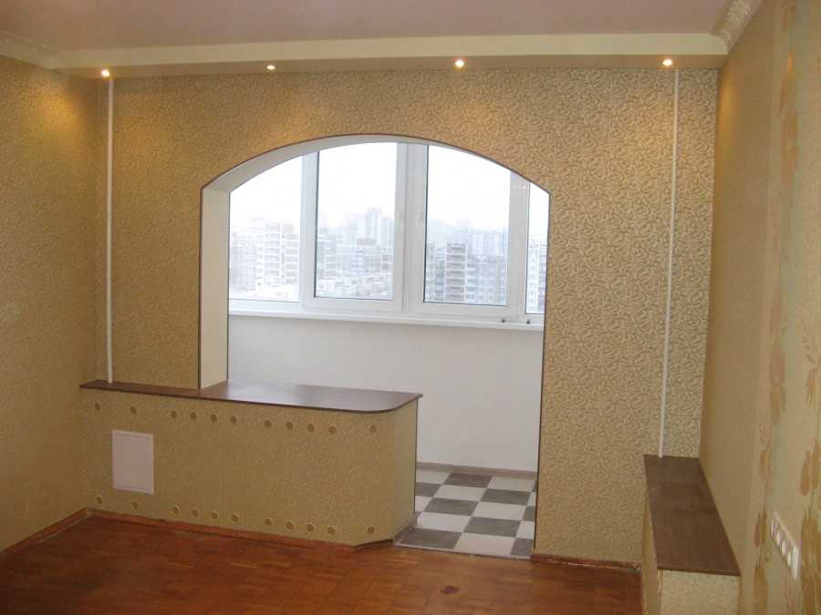 - При выходе на застекленный балкон из кухни, дверной проем можно оформить в виде арки. Подоконник можно заменить столешницей. За счет присоединения квадратных метров балкона, кухня станет больше и уютнее.