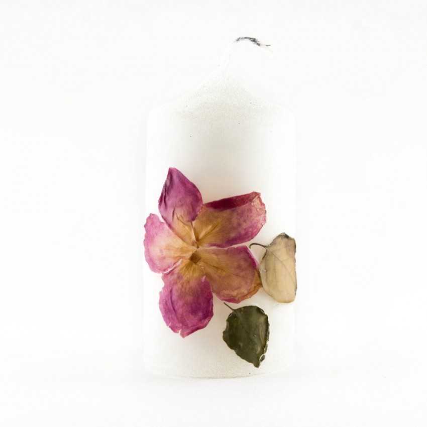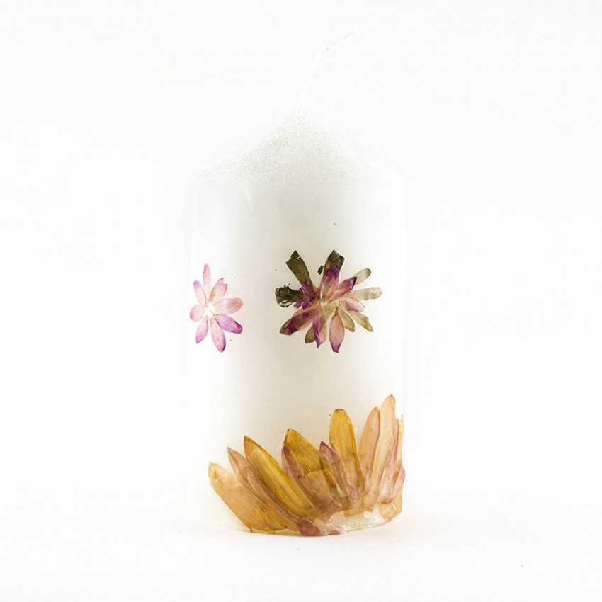 - Если свеча декорирована сухоцветами, её полностью опустить в растопленный парафин. Элементы декора из бумажной салфетки слегка отшлифовать сухой чистой губкой.