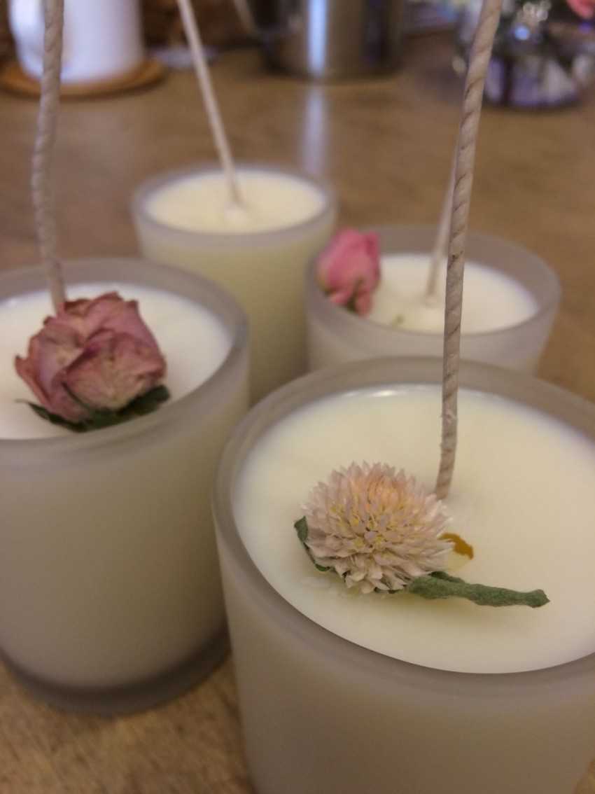 Простой способ украсить аромасвечи. Для оформления боковых поверхностей свечек при помощи бумажных салфеток или сухоцветов используется «горячая» технология:
